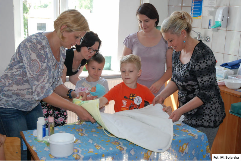Zajęcia z zakresu położnictwa miały dostarczyć podstawowej wiedzy na temat pielęgnacji noworodka (np. obejmowały sposoby oznaczania noworodków po urodzeniu), jak również wyjaśnić i pokazać sposoby i zasady higieny przy zmianie pieluszki i zawijania noworodka w rożek, itp. Dzieci mogły jednocześnie wziąć udział w ćwiczeniach przewijania oraz karmienia dziecka.